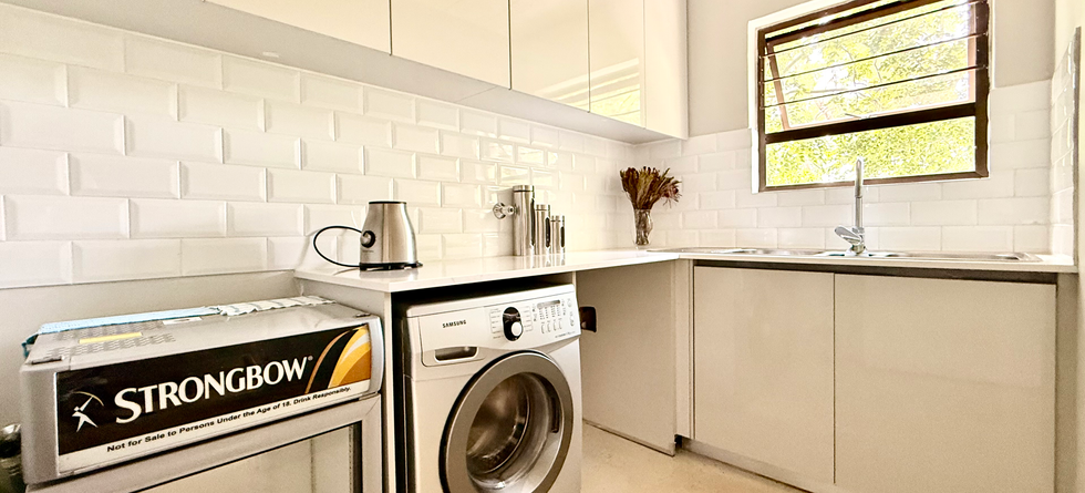 The ground floor welcomes you with a large study to the right, ideal for a dedicated work-from-home setup. A guest bathroom is conveniently located down the hallway, leading through to a spacious lounge with ample room for comfortable family living and movie nights. Adjacent to the lounge is the dining area, easily accommodating an eight-seater table and flowing seamlessly into the well-appointed kitchen. The kitchen features Caesarstone countertops, a gas stove, generous cupboard and appliance space, as well as a well-sized scullery with additional appliance accommodation. A covered patio extends from the living areas, creating a perfect space for entertaining.