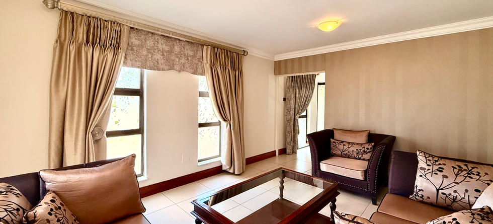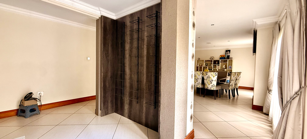 A pillar-framed driveway creates a striking sense of arrival. Inside, a dramatic double staircase flanks the entrance hall, immediately setting the tone. To the right is a formal lounge with ample space for a full lounge suite, while a guest toilet is conveniently positioned on the opposite side. Moving deeper into the home, the informal lounge offers generous family living, complemented by a separate pyjama or TV lounge for more intimate evenings.