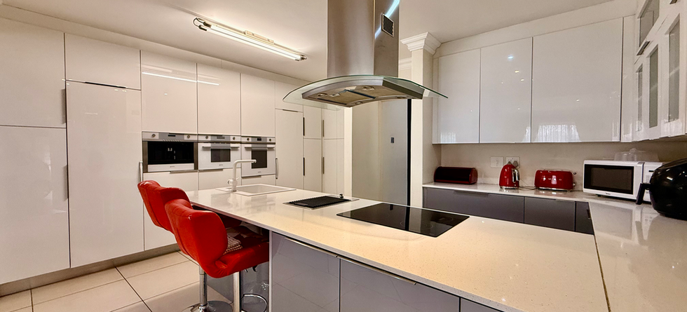 The entertainment area is designed for hosting, featuring space for a large dining table, a built-in braai, a bar area, and stacking doors that open to the garden and park beyond, ideal for effortless indoor-outdoor living. On the other wing of the home, the spacious dining room is overlooked by a stylish kitchen with extensive counter and cupboard space, complete with built-in Smeg appliances. A large scullery provides additional workspace, storage and appliance accommodation.