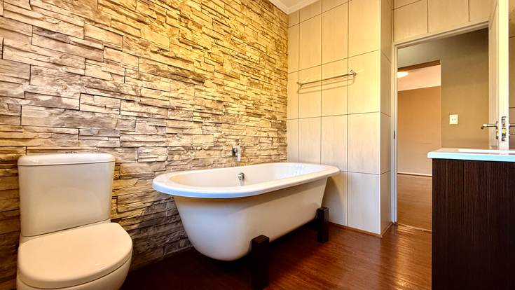 The first bedroom is spacious and light-filled, with room for a double bed and ample built-in cupboards. The full bathroom is tastefully finished, featuring a bath, shower, vanity, and toilet.